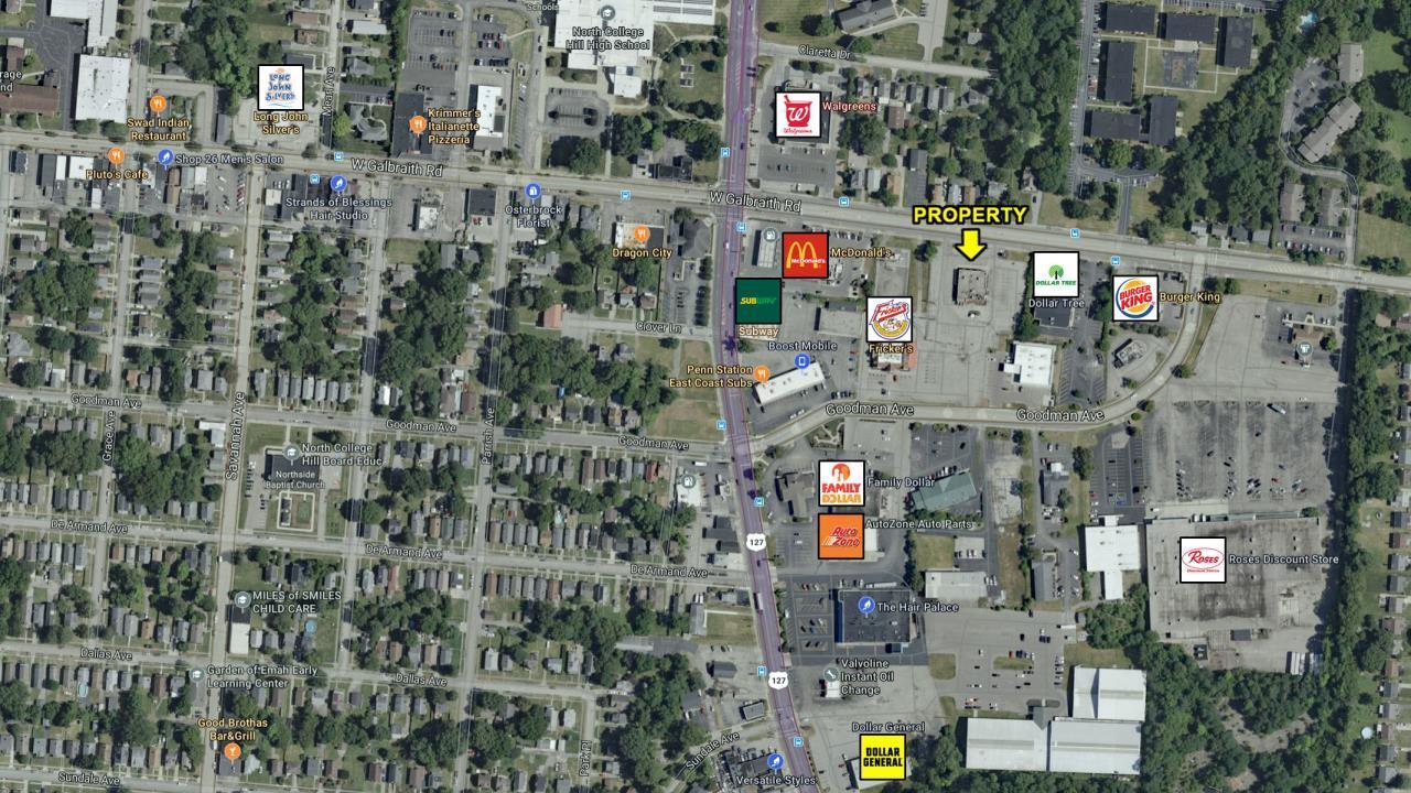Sited North of Downtown Cincinnati at the intersection of Hamilton Avenue and West Galbraith Road this +/-5,086 square foot former franchise restaurant is ideal for continued use as a restaurant, retail or other commercial enterprise that would benefit from this central location. All subject to county approval. Features Include: